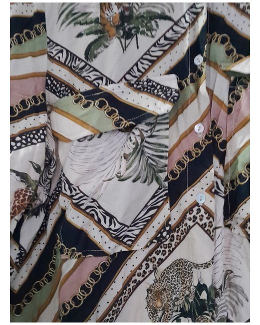 Stunning rare Stradivarius Blouse with leopard printed on and various multi pattern based colour beige with black, pink and green patterns. Delicate shell buttons, 2 breast pockets with flaps and gorgeous giraffe, zebra, tiger and antelope pattern on the back. Viscose, feels like silk. Will fit 8-10. RRP £90