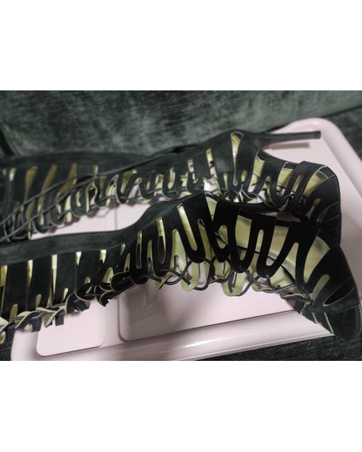 These are chic black strappy high knee sandals for women, featuring a synthetic upper material. The UK shoe size is 5.