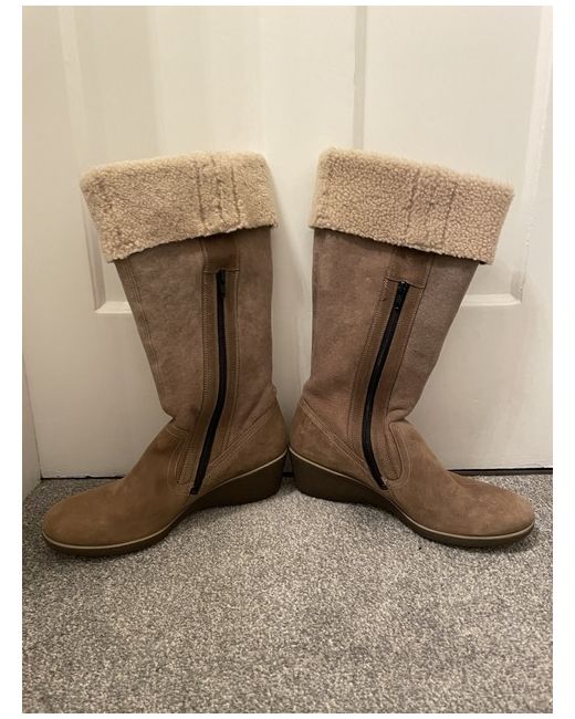 Step out in style this winter with these ECCO Tall Winter Boots. The boots are made of high-quality leather with soft shearling material, ensuring maximum comfort and warmth. The mid-calf style and wedge heel make them perfect for any occasion, whether it's casual wear, workwear or travel. The beige colour with fur trim accents adds a touch of elegance to the shearling style. The boots are available in UK size 6.5 / EU size 40. These boots are sure to keep your feet warm and dry throughout the winter, autumn and spring seasons. Brand new without box