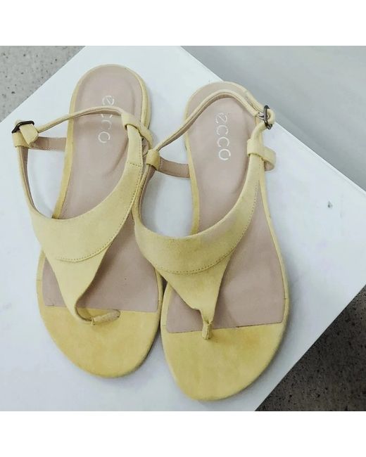These lemon yellow flat sandals from ECCO are the perfect addition to your summer wardrobe. With straps and a flat heel style, they are comfortable for all-day wear. The suede outsole material and leather lining and insole material provide a luxurious feel. The sandals come in UK shoe size 5.5, US shoe size 7.5, and EU shoe size 38. They feature Belle as the character, and are not customised or vintage. The brand is ECCO, and they are categorised under Clothes, Shoes & Accessories, Women, Women's Shoes, and Sandals.