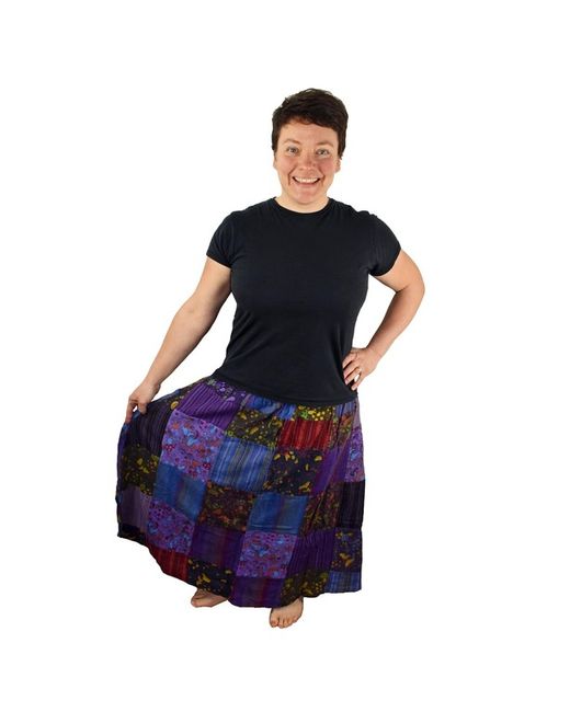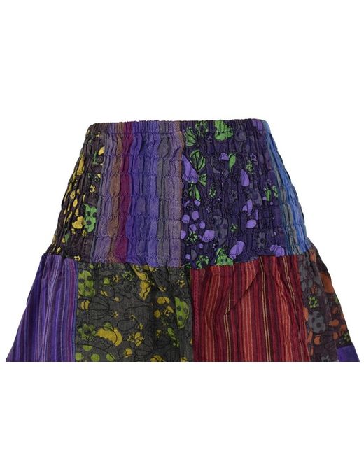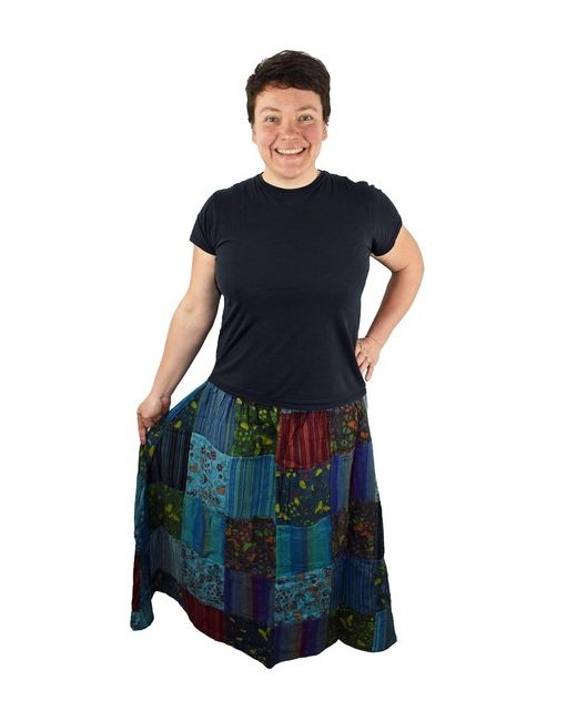 Patchwork Mushroom Print Skirt. These patchwork skirts are made from patches of printed cotton with a mushroom pattern, then overdyed blue or purple for a more uniform colour. They have a wide shirred elastic waist so will fit many shapes and sizes of body and can also be worn across the chest as a strapless dress as well.