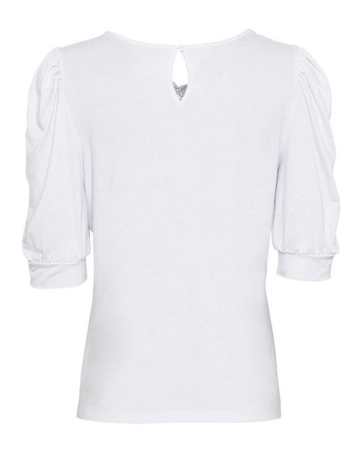 Elbow length cuffed sleeves that are gently gatered at the shoulder to give a puff sleeve effect. 95% viscose 5% elastaine, cotton lace, washable OSP £29.99.