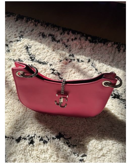 Never used, immaculate condition. The Jimmy Choo Small Pink Leather Bag is a stylish shoulder bag designed specifically for women. Handcrafted in Italy from luxurious bight pink leather, this moo -shaped bag features a small size and a pink handle/strap, adding a touch of sophistication to any outfit. Perfect for carrying essentials, this bag exudes elegance and timeless charm, making it a must-have accessory for any fashion-forward woman.