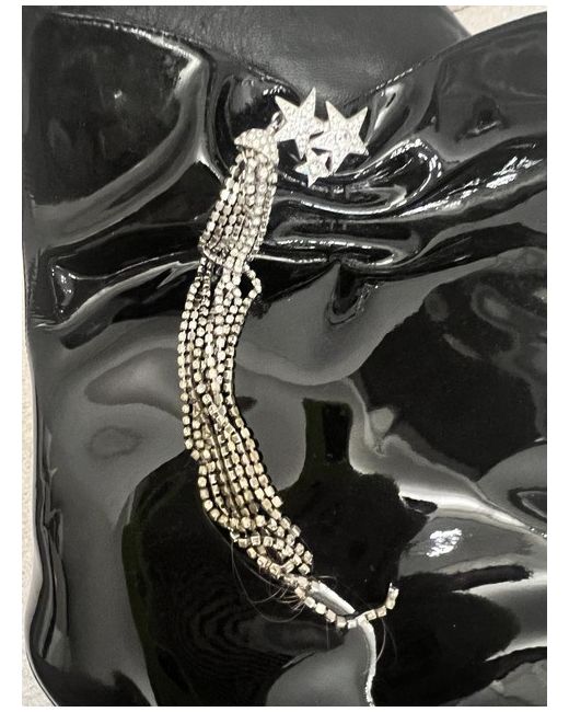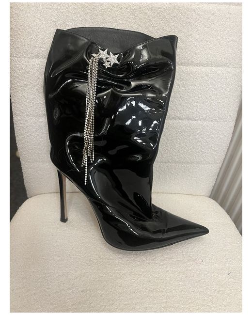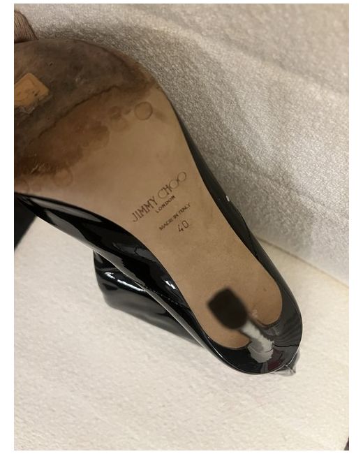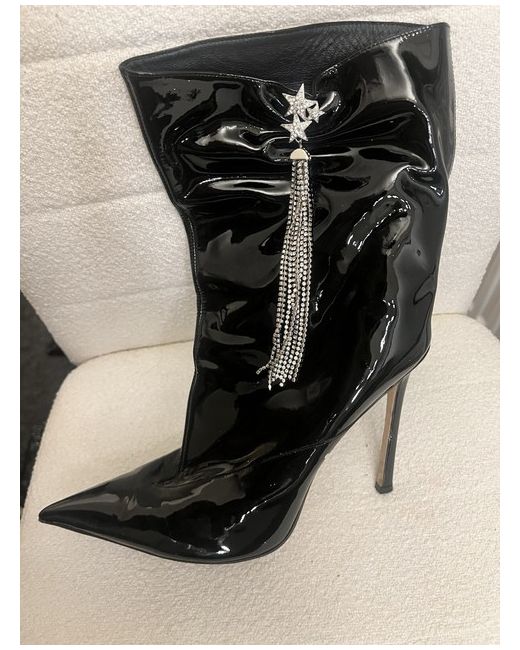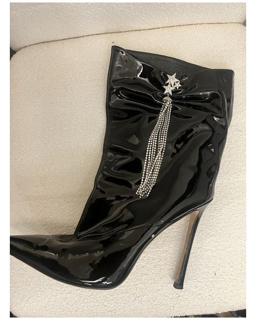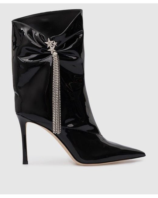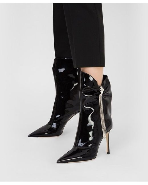 Jimmy Choo patent ankle boots with stiletto heel and Diamante embellishment Size 40 Oriel boots 110mm heel ankle boots Black leather Crystal embellishment Pointed toe Slip-on style Ankle-length High heel Composition: Calf Leather 100% Sole: Calf Leather 100% Lining: Calf Leather 100% Circumference: 11.8"/30 cm Heel: 3.5"/9,5cm Height: 6.3"/16