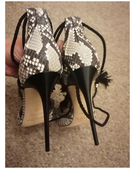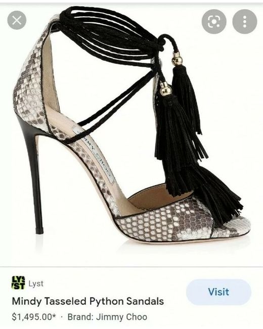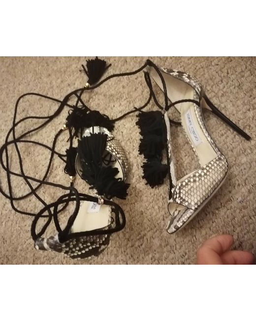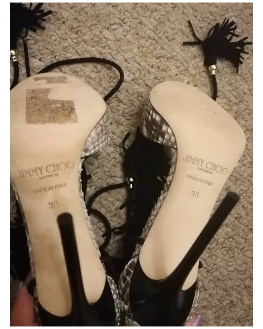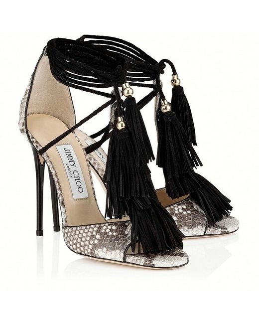 Superb and sexy Jimmy Choo Mindy Tasseled Python Sandals Heels 38 UK 5 new. The sticker on the right outer sole has been removed and some residue got stuck when shoes tried on. There are also some water marks. Please check pictures. Otherwise heels are in perfect new condition, never been worn, inside or outside. Rrp approx $1, 500. Seen on celebrities.
