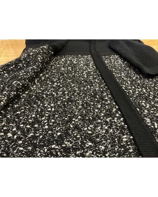 This cardigan-style jacket features a sophisticated black and grey tweed accents, adding a touch of elegance to your ensemble.