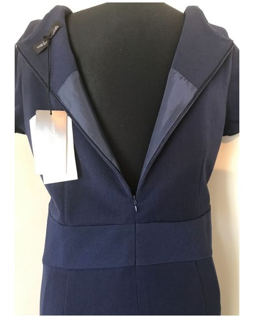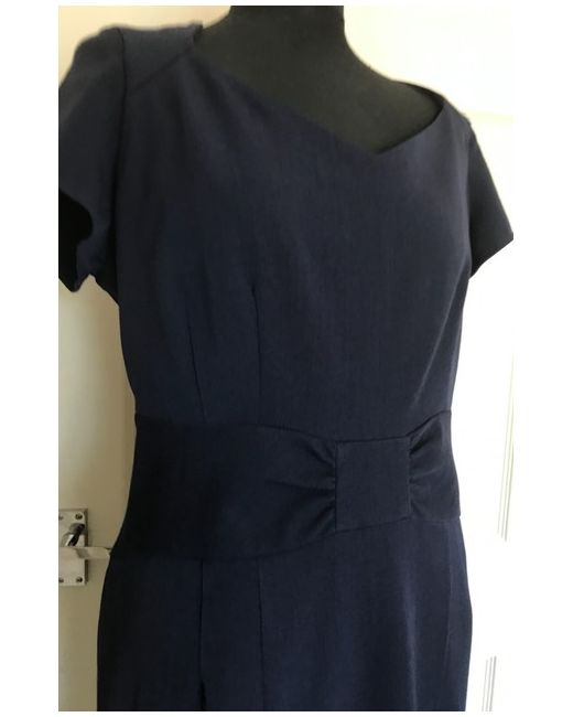 Classy midi shift dress from Wardrobe Essentials, size 16 (44). Navy in colour. Thick pannelled shift dress. Short cap sleeves. Back split - 20cm (8in). Thick banding at waist - in the shape/appearance of a bow.