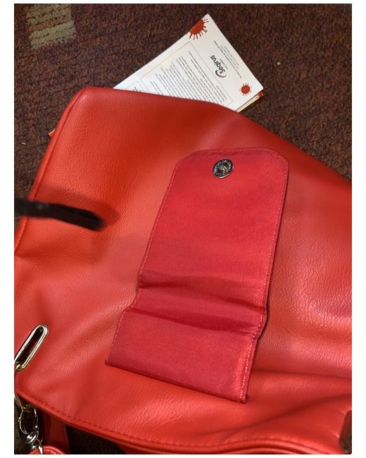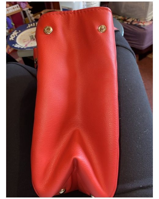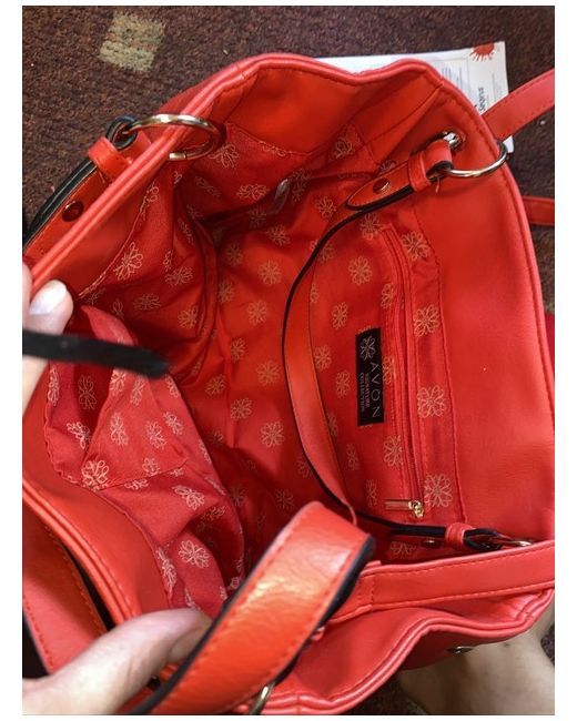 Red Avon Bag. Has been stored away for a while Spacious inside with two inner pockets , magnetic fastening outside and two type carry straps Button fastening on side to narrow bag Length is More than 30 cm Height is 30cm Width is 12 cm
