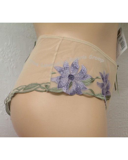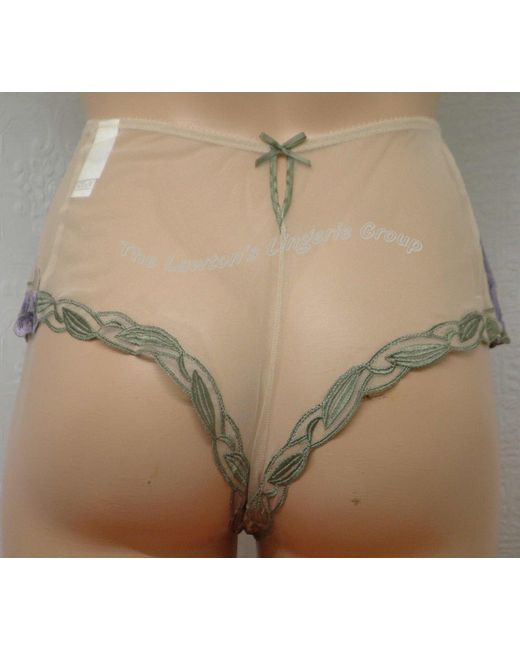 Is a French Brief to match with Charnos Indulgence Underwired, Lace Bra range, ID001 Full cup and ID002. It is made in deep, plain, fine net with embroidered multi-coloured floral pattern on both side of legs.