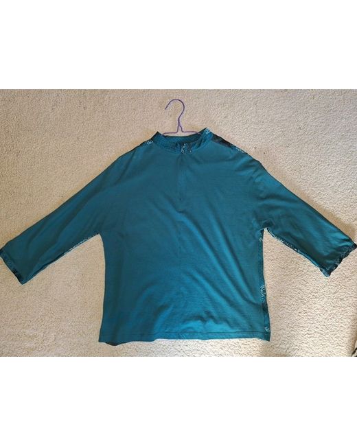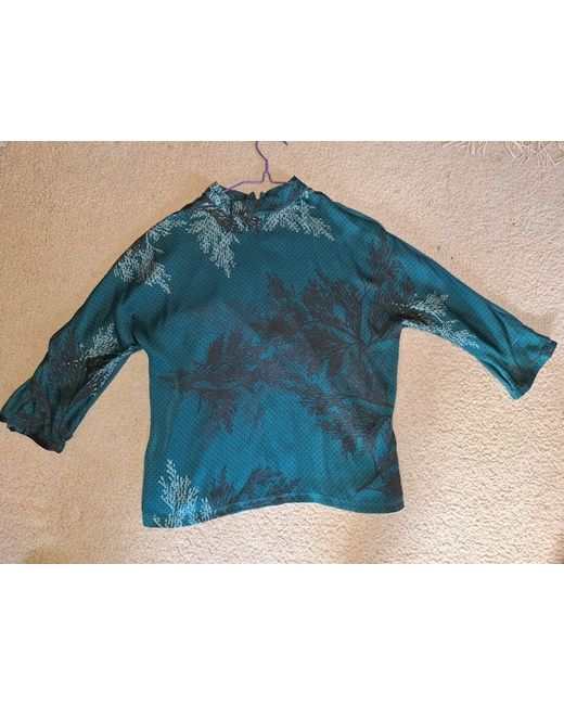 Turquoise blouse with black floral patterns. Front in silk and back in cotton cotton. Elegant finitions.