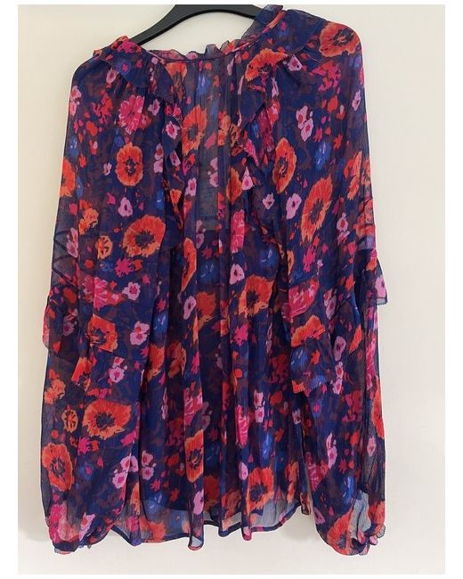 New for Autumn, our in house designed Celestial Floral print has been re-imagined in jewelled hues. Textured viscose crinkle, this easy fitting round neck shape has feminine ruffle details, voluminous pleat detail sleeves and softs front and back gathers. A button fastening allows you to wear as a v neck also. Side hem splits and elasticated cuff. Tuck into tailoring, jeans or leather separates.