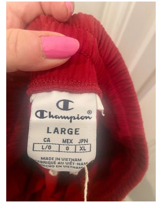 These are a pair of Champion red joggers in size large, suitable for both men and women. The trousers have a straight leg style and are designed for regular fit. Made by the brand Champion, these joggers are a stylish and comfortable choice for casual wear. Perfect for lounging or working out, these red joggers add a pop of colour to your wardrobe.