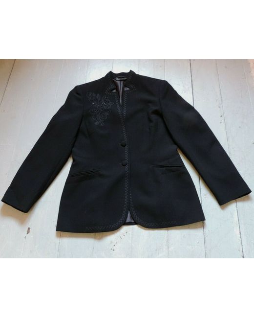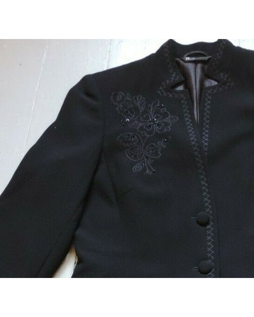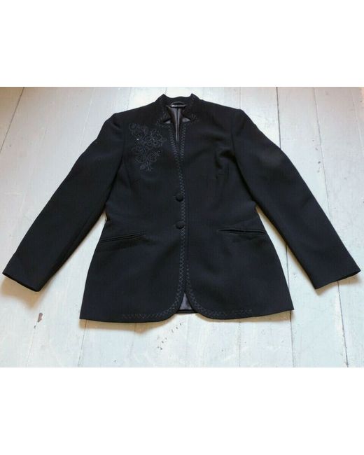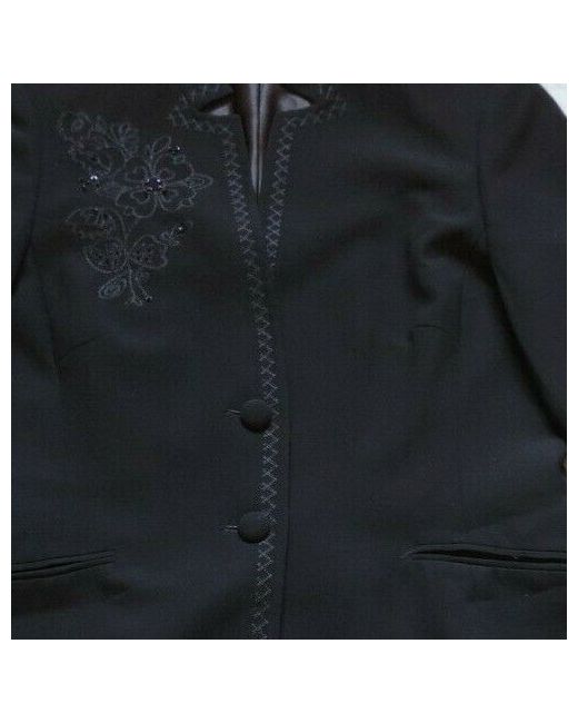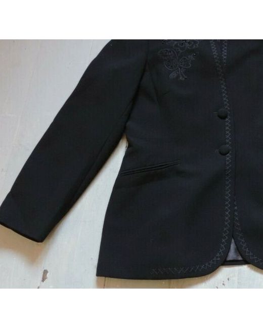 Single button front with stand up collar, long sleeves, 2 slotted low pockets, fully lined, woven textured fabric, embroidered down front edges and round neck & collar and round hem, embroidered and beaded floral motif on shoulder.