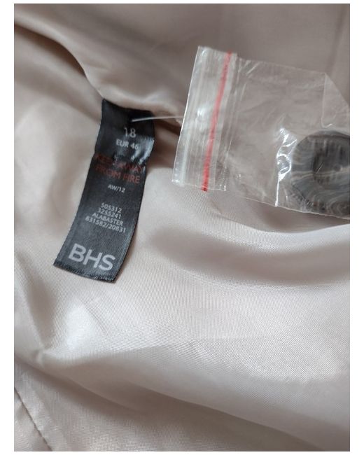 This is new, without tags although it still has the spare button attached. It is a size 18, in a soft camel colour. It has a detachable faux fur collar. It feels like a soft wool fabric but is a polyester mix. Length 37". Very well made, good quality.