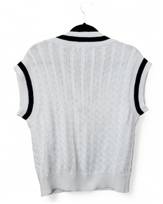 La Redoute Sleeveless Pullover Cable Knit Jumper in an ivory cream colour, with a blue contrasting trim. The jumper is a sleeveless, pullover style perfect for layering or wearing on its own. The cable-knit design adds texture and detail, making it a statement piece in any wardrobe. Size Medium Pit to Pit 18" Length 24.5" Material 60% Cotton 40% Polyester