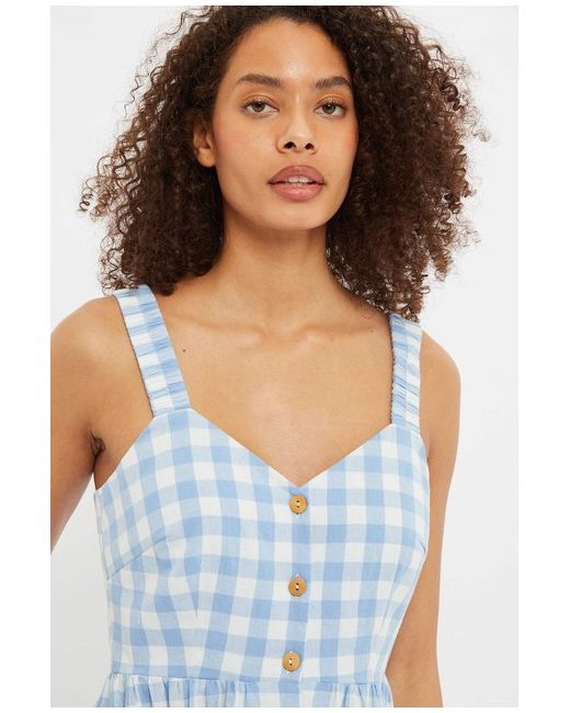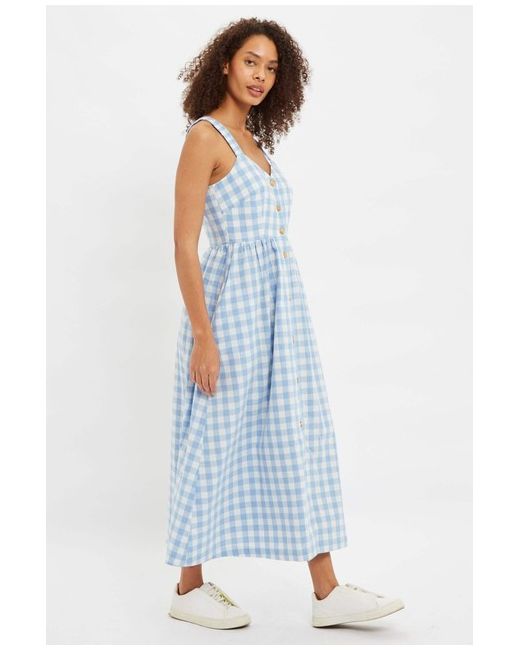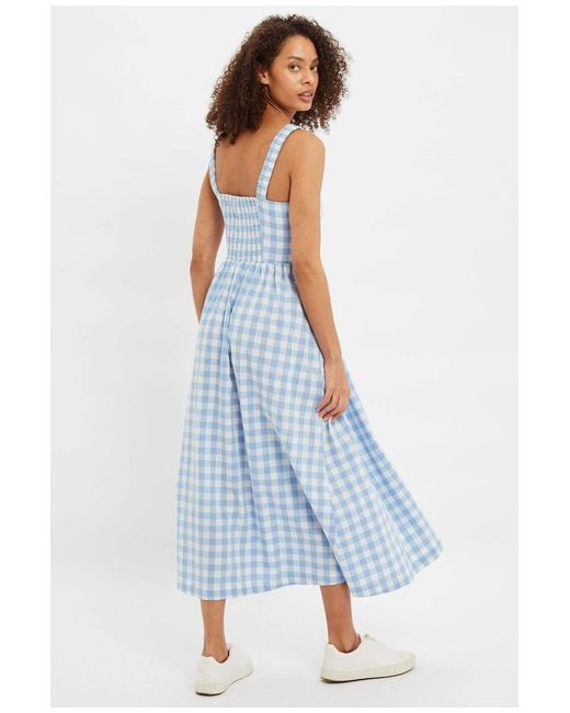 Clover Picnic Check Button Through Midi Sundress In Blue Step out in ultimate comfort and style with the Louche Clover Sundress. Its signature pockets provide added convenience on the go. 100% COTTON Cool machine wash.