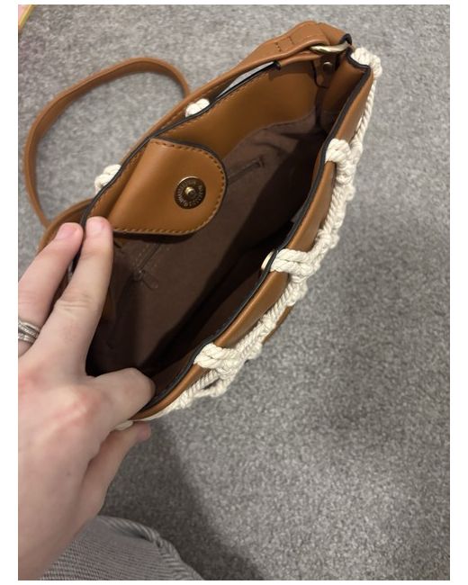 This Matalan Crossbody Bag for women features a stylish brown exterior with white ropes across it. It is a new item without tags and is perfect for adding a fashionable touch to your outfit.