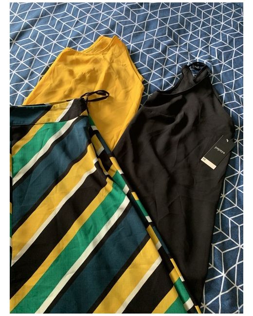 This is a new 3-piece set from Matalan for women in size 16. The set includes a multi coloured skirt and matching camisoles, in black & yellow perfect for a stylish summer outfit. This coordinating ensemble is versatile and can be mixed and matched with other pieces in your wardrobe. The set is not vintage and is ideal for creating a fashionable look for the season.