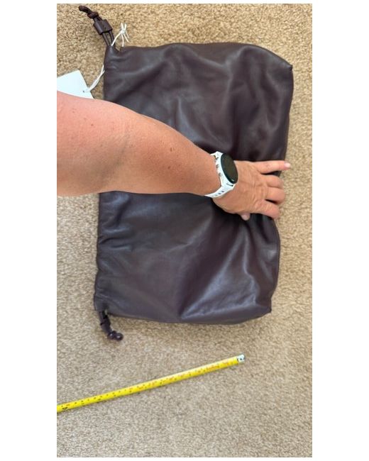I am not responsible for sizing. Soft leather, drawstring closure. Strap is easy removable, can be used as a large clutch bag also.