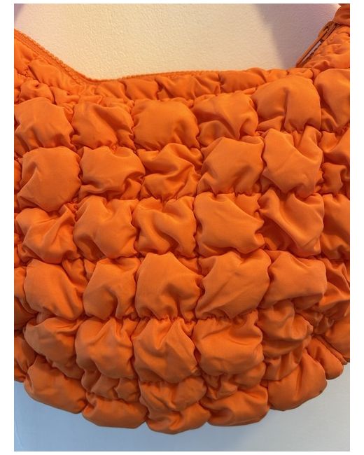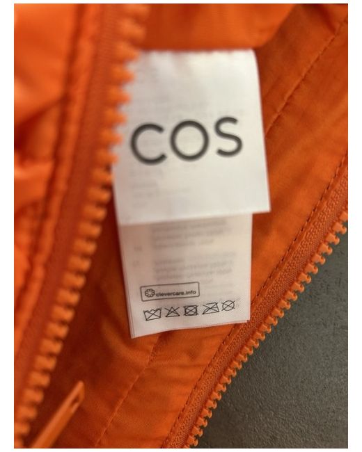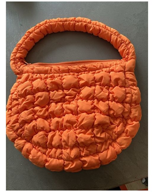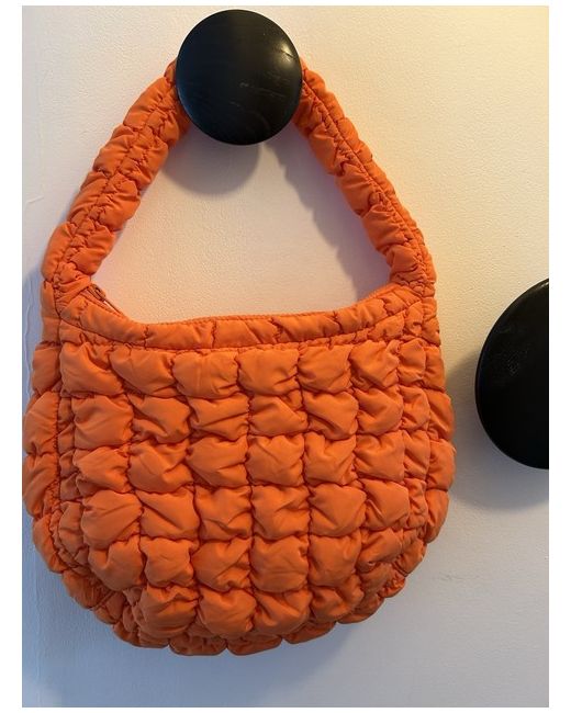 Bright orange version of the classic COS quilted bag with the signature pillowy texture. This is the small shoulder bag size, 33cm wide. Exterior is polyester and lining is cotton. Zip closure. One zipped interior pocket.
