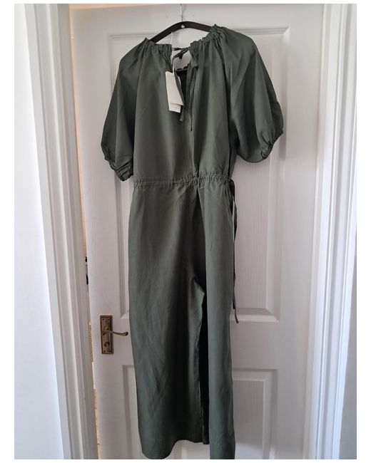 This COS green cotton jumpsuit is perfect for any party or cocktail occasion. The gathered neckline and drawstring closure add a touch of elegance to the baggy fit and lightweight, breathable fabric. With a comfortable, adjustable waist and puff sleeves, this jumpsuit is both stylish and practical. The collarless design and oversized style make it a great choice for any season, whether it's autumn, summer, or spring. The jumpsuit is machine washable and made from Tencil Lyocell fabric, which is both comfortable and durable. With its unique features and no-pattern design, this one-piece jumpsuit is a must-have for any fashion-conscious woman.