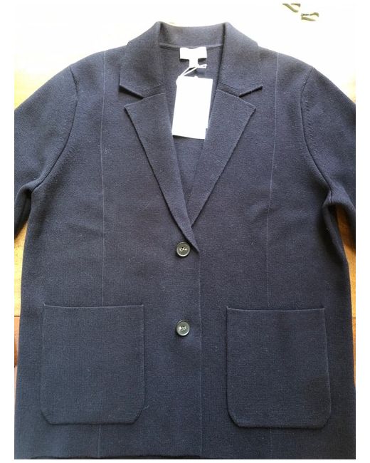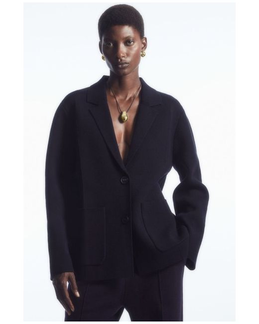 COS knitted jacket / blazer. Autumn/Winter 2023/24 collection. It's crafted from an RWS-certified wool blend and expertly knitted in a premium Milano stitch, chosen for its compact structure that gives the knit a contemporary, structured finish.