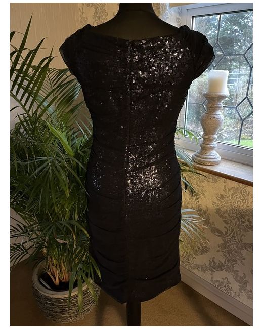 Joseph Ribkoff 10 Blue Sparkle. A beautiful JR Dress fitted with rear zip closure, small cap sleeve, sits around the knee depending on height, a lovely sparkle sequinned dress with a fine sheer net overlay giving a subtle illusion of sparkle all over. The net overlay falls in folds o. The front and back of the dress so is very flattering. The photo does not do the dress justice it really is a pretty dress. A beautiful dress for special occasion, cruise etc. easy to pack