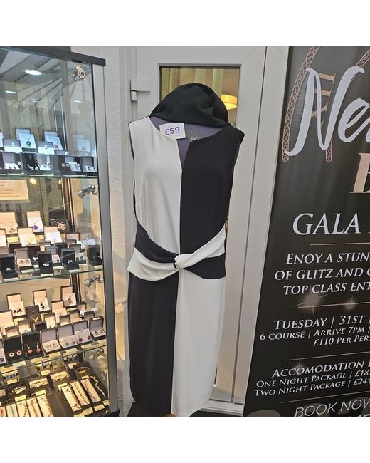 This stunning Joseph Ribkoff dress is perfect for summer occasions. With a sleeveless design and cap sleeves, it features a round neckline and a zip closure for easy wearing. The dress is made of high-quality polyester material, ensuring that it is both comfortable and durable. The knee-length bodycon dress is available in size 12/14 and comes in a beautiful white and black colour scheme. It is recommended that the dress is dry cleaned only to maintain its quality. The dress is not only stylish but also practical, making it a great addition to any wardrobe. This dress is perfect for women who want to look their best while staying comfortable.