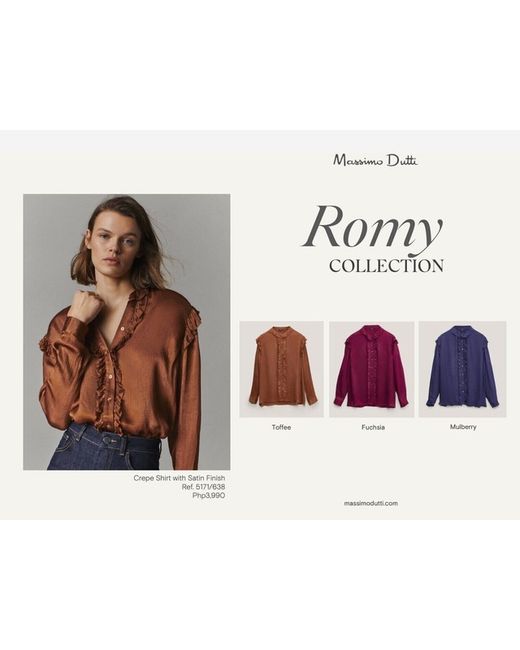 Crepe blouse with satin finish. Collared, Long sleeves. Ruffle detail. Front button closure. Composition – 100% Viscose.
