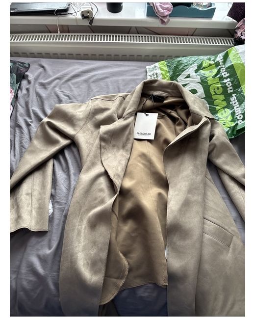 This is a brand new Pull&Bear beige suede jacket in size L for women. The jacket features a shearling fabric type, button closure, and a casual style, making it a versatile piece for various occasions. The outer shell material is suede, giving it a stylish and trendy look. This jacket is perfect for adding a touch of sophistication to your outfit while keeping you warm and comfortable.