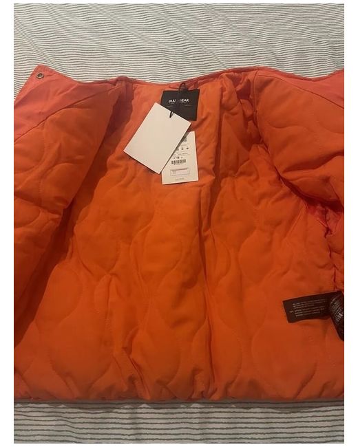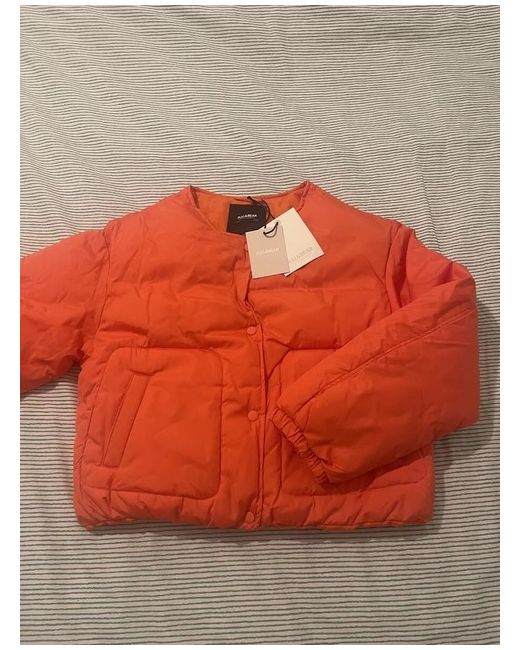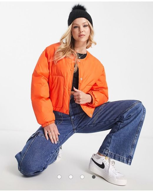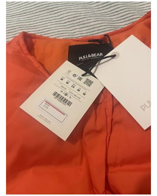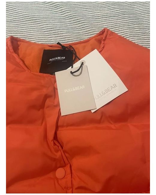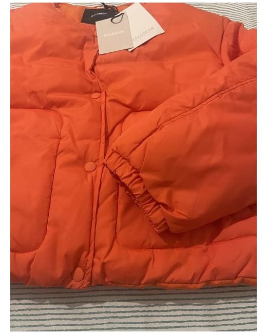 This is a new women's Pull&Bear light padded collarless jacket in orange, perfect for autumn and spring. It is a short puffer jacket with a regular fit, made of polyester. The jacket features a padded design and is in size M. Ideal for adding a pop of colour to your wardrobe.