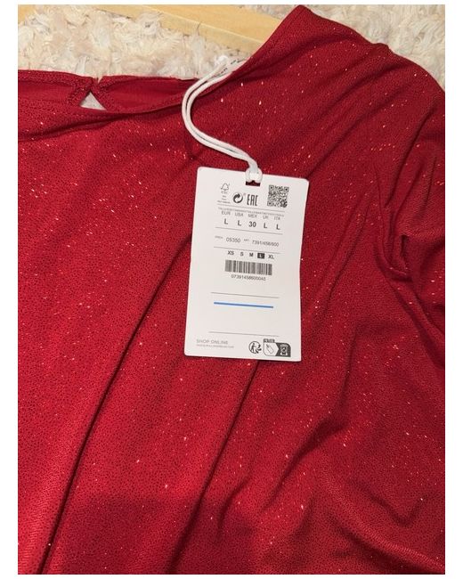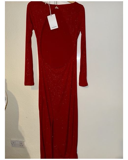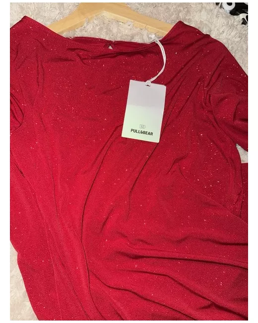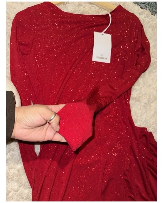 This Pull&Bear dress is a long red maxi style made of polyester and elastane with a Rayon fabric type. It features a crew neck, long sleeves, and an open back. Perfect for parties or cocktails, the dress is adorned with glitter and has a seasonal versatility suitable for winter, autumn, summer, and spring. The size is L and the brand is Pull&Bear.