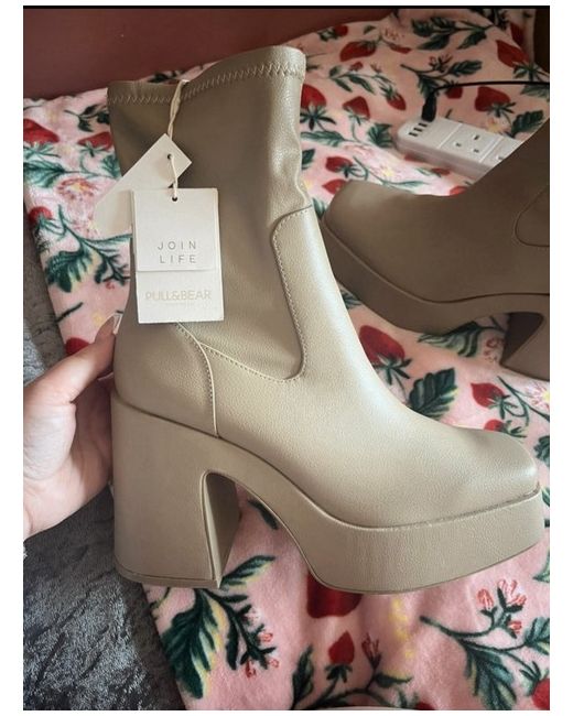 These Pull&Bear women's platform boots in size 7 feature a wedge heel style and are made of beige faux leather. The boots have a stylish and trendy design suitable for women's casual wear. Have a few marks on bottom from being worn in the store but otherwise brand new