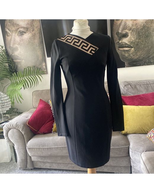 Beautiful Versace zip back dress with mesh panel Size 42 however I wasn’t able to fit into it I’m Uk 10-12 more 12 if I’m honest but it was just to tight. Knee length perfect for dinner or event paid £680 Had it dry cleaned as it had some marks from body cream Also it has some stitches coming away on both arms close to bottom which can easily be seen back. It’s very slim fit ,viscose fabric with is also very flattering when on.