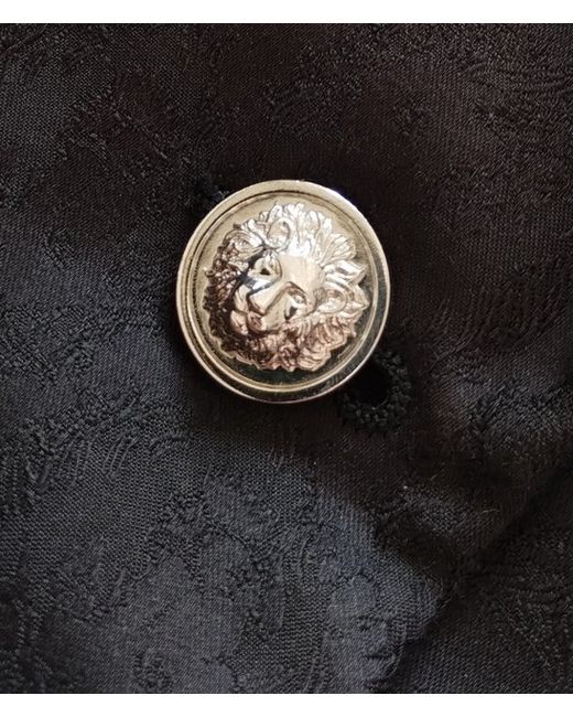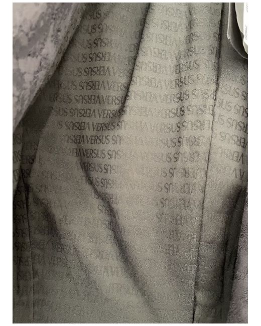 This Versace Versus jacket is crafted from a blend of cotton and polyamide in a grey hue with a hint of light aubergine. The mid-length blazer features a single button closure, long sleeves, and iconic lion pattern accents.