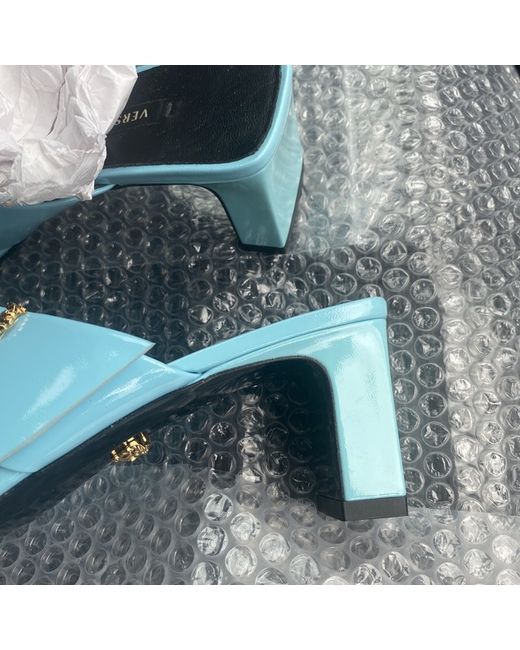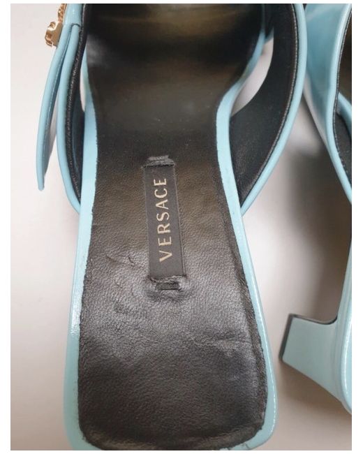 Versace Summer Mules. Leather with a PVC blue material with gold hardware . Size uk3.5. Only worn once but no box or dust bags. The heels are slightly discoloured as shown in the photos but hardly noticeable. These could be worn by a slim foot size uk 4.
