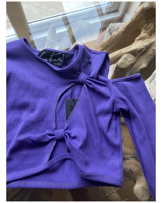 Couture Purple Knotted Crop Top size 8 New with tags, never been worn. Knotted detailing at the front and thumbs holes at the bottoms of sleeves. Beautiful statement piece. Photo shows the top on a model, give you an idea of what it looks like. However the item I am selling is purple not white. Thanks for looking!