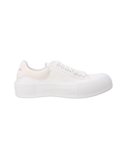The Alexander McQueen Deck Contrast Snkr in white features a sleek design with a 45 mm heel, perfect for casual wear during spring and summer. These low top trainers are made from fabric with a rubber outsole and fabric insole for added comfort. The lace-up closure ensures a secure fit. Available in EU size 38.5, these sneakers are ideal for women looking to add a touch of luxury to their footwear collection.