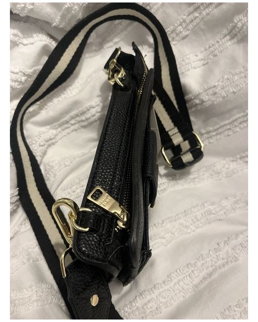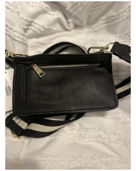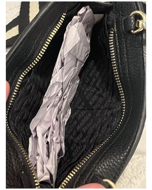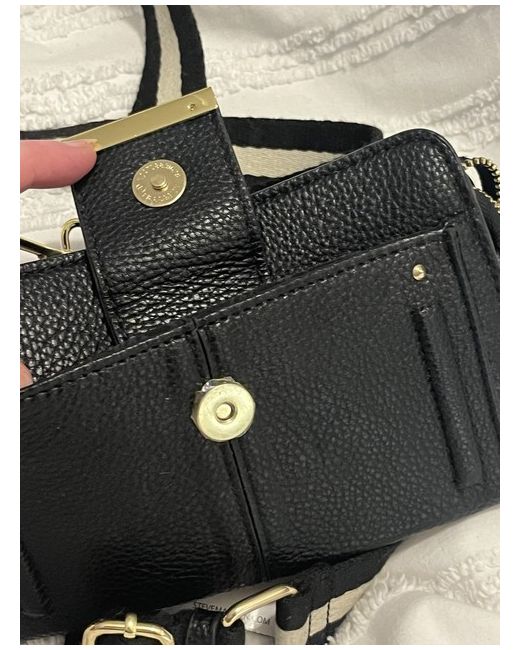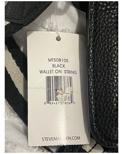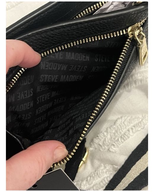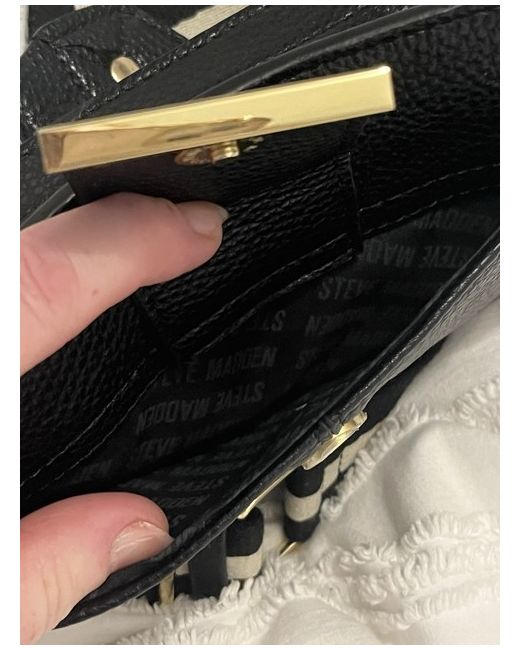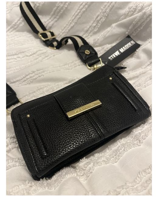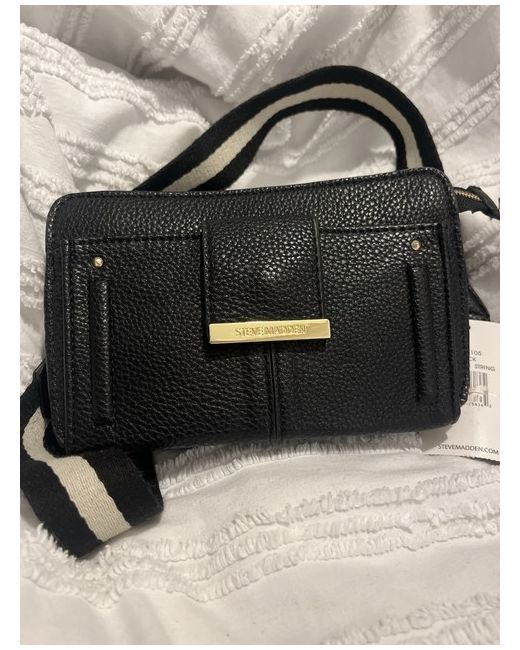 Steve Madden black crossbody bag Brand new Unwanted gift Zip pocket on back Clasp on front opens up to pocket Card holders sections at back inside main part of bag Strap is material and is black and cream