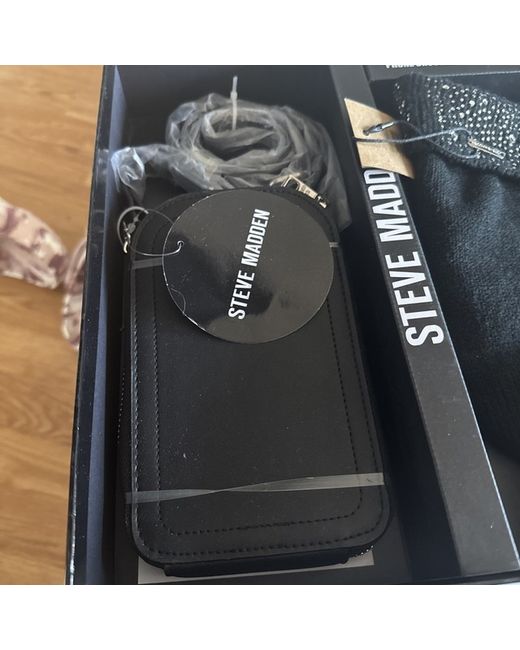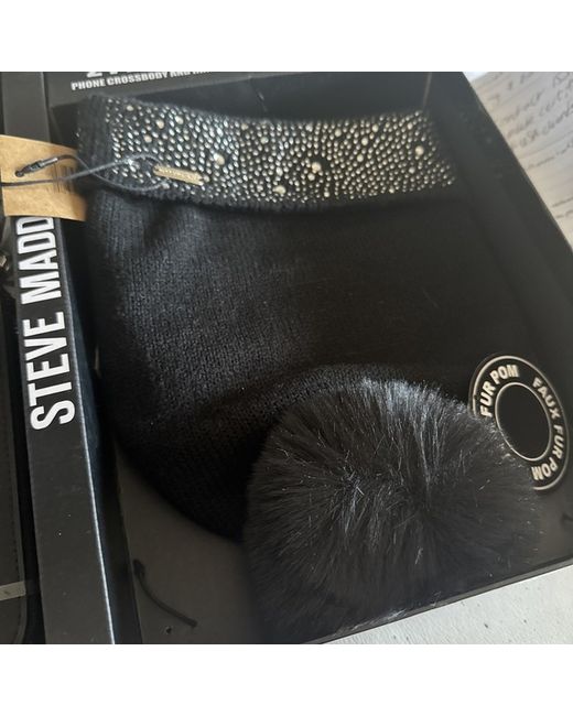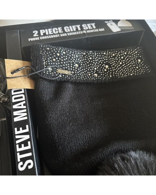 This Steve Madden gift set includes a black faux leather crossbody bag and a matching hat. Both items are new with tags. The bag features a sleek design perfect for carrying essentials, while the hat adds a stylish touch to any outfit. Perfect for women looking for a versatile and chic accessory set.