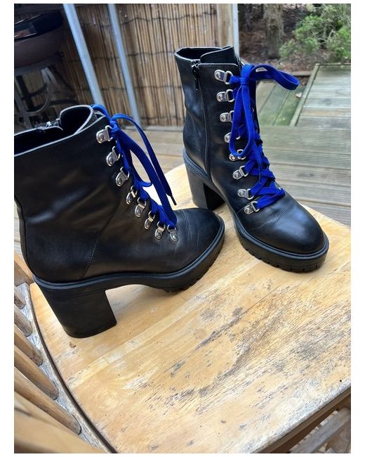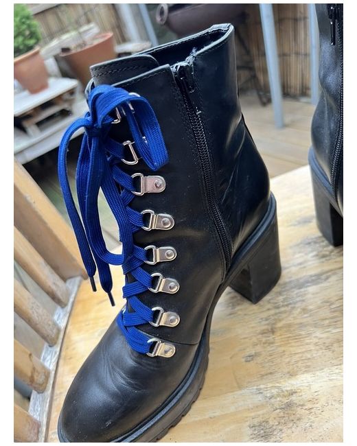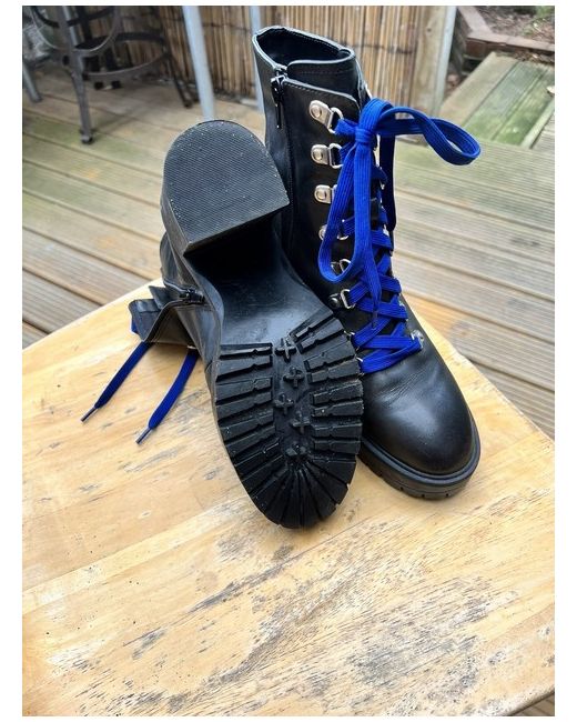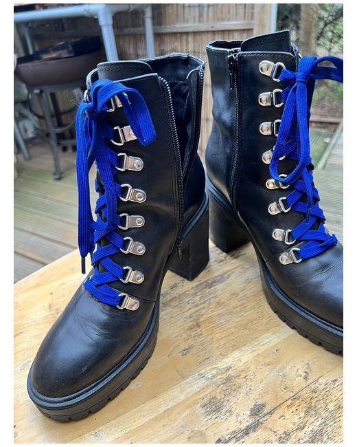Leather Steve Madden boots worn once with bright blue laces. Chunky block heel approx 3 inches high.