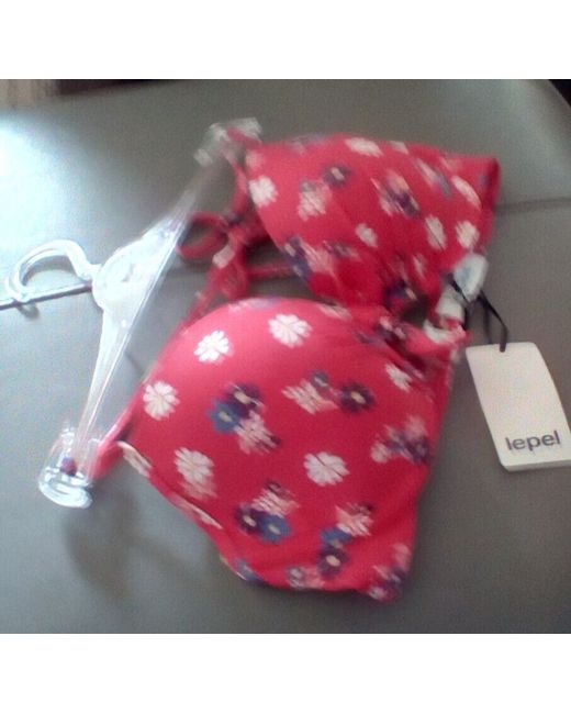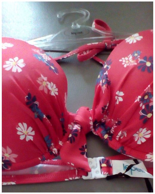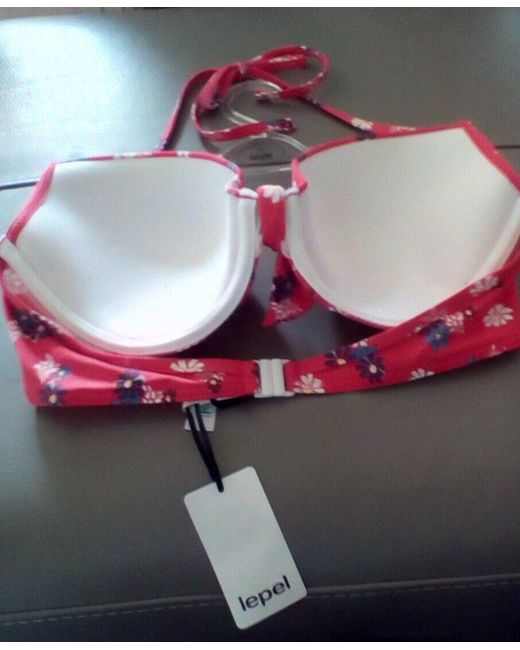 From Lepel Daisy push up top in red with blue black and white daisy design , underwired, back clasp, halter tie, knot design in front in size 36DD