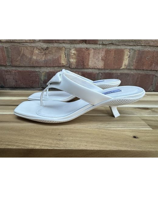 Prada sandal kitten heels in white size 38. Brand new in box. Very slight yellowing above Prada badge- only very faint and can’t be seen in most lighting. Perfect for summer!