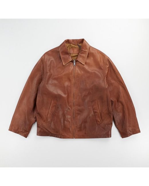 A high-quality PRADA men's brown leather jacket featuring a zip closure and logo accents. Crafted in Italy, this mid-length jacket is perfect for spring and summer seasons. Size 40, dry clean only.