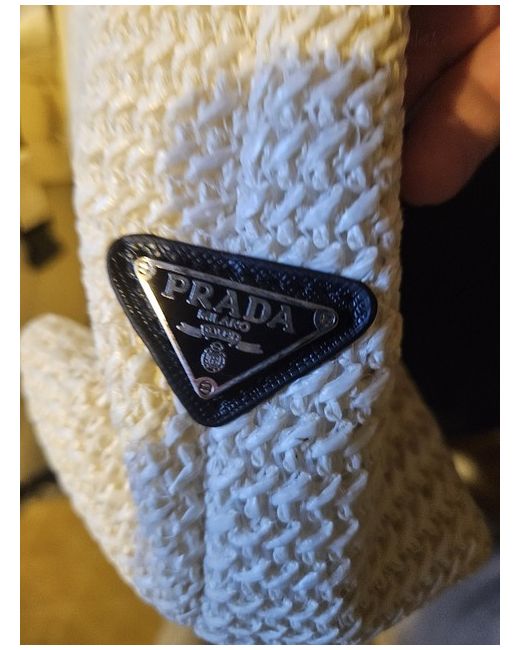 This is a stylish and spacious tote bag from the renowned fashion house Prada Milano. It features a zip closure and is made from a combination of hemp and polyester, with a white exterior and leather handles/straps. The bag is perfect for women who want a large, versatile accessory that can be carried with ease. The bag is ideal for everyday use, with enough space to carry books, a laptop, and other essentials. The white exterior provides a chic and timeless look that can be paired with any outfit, while the leather handles/straps add a touch of luxury and durability. This Prada bag is perfect for women who want a high-quality accessory that is both functional and stylish.