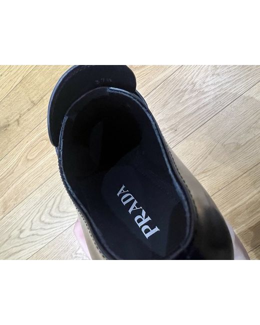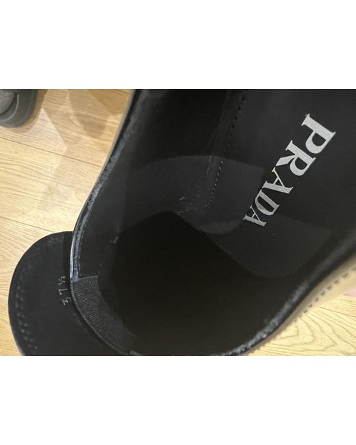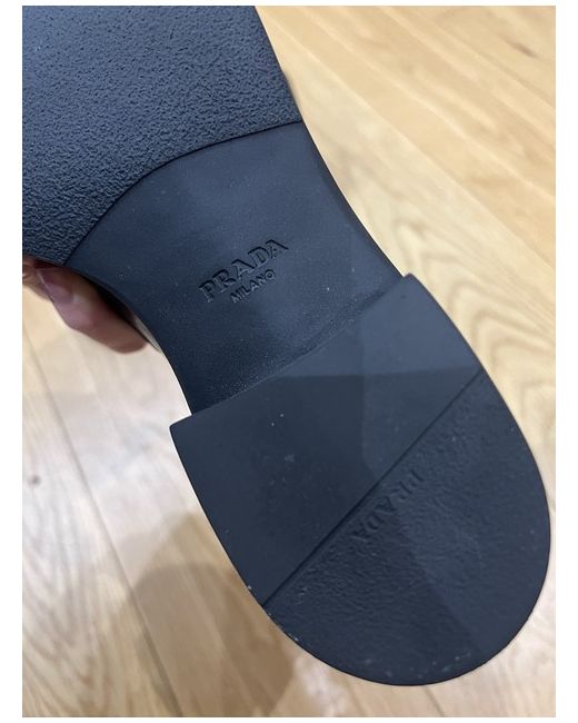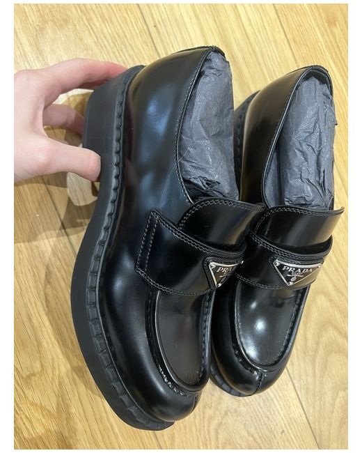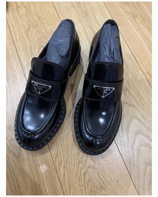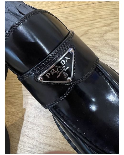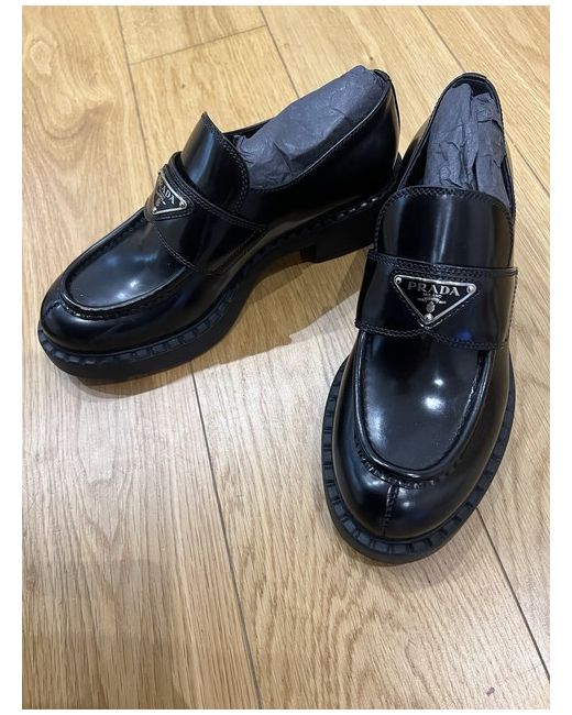 Prada loafers Black leather Worn once, too small for me Size 37 1/2 (4.5 UK) Come with silk dustbags Receipt available for proof of purchase (ask me) RRP £920 Product details on website: Emphasized by the iconic enameled triangle logo, these retro-inspired loafers are made of brushed leather, traditionally used in classic fine footwear and reinterpreted in Prada collections on unexpected designs for a hybrid result that reflects the duality of the brand. The notched effect of the welt around the shoe gives it a handcrafted touch. Upper with leather strap Enameled metal triangle logo 50 mm rubber monobloc sole with hot-stamped logo Notched-effect stamped rubber welt