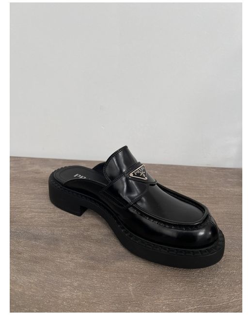 Prada Chocolate brushed leather mules Brushed leather, traditionally used for classic fine footwear, has been reinterpreted in Prada collections since the '90s on unexpected designs for a hybrid result that reflects the duality of the brand. Leather saddle strap on the upper Apron with stitched raised edge Enameled metal triangle logo Rubber monobloc soles with heat-stamped logo, height: 40 mm Brand New
