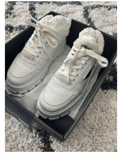 Elevate your shoe collection with these stylish PRADA leather sneakers. Perfect for women, these trainers feature a shearling lining for added warmth and comfort. The sleek white design is sure to turn heads and the 5.5 UK shoe size/7.5 US shoe size fit is perfect for any occasion. Crafted by the renowned PRADA brand, these sneakers are made with the highest quality materials and feature a lined interior for added comfort. The sleek sneaker style is perfect for any casual or formal occasion. Don't miss out on the chance to own these must-have PRADA leather sneakers. Really good condition, may need new laces!