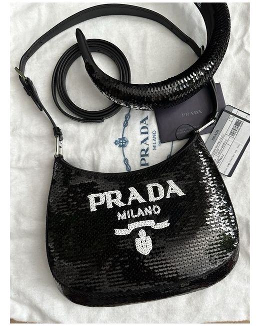 This stunning new edition of the otherwise classic Cleo model bag it's covered in sequins and fully lined with signature Prada nylon featuring contrasting branding. A 2024 model currently retailing on MyTheresa at £1,736 and the matching headband RRP£480 The bag SIZE & FIT: • Height 15,5 cm-6" • Min. width 22cm-8.5" • Depth 4cm-1.5" • Min. length of handles 42cm-16.5" • Max. length of handles 52cm-20.5" • Min. length shoulder strap 129 cm-51" • Max. length shoulder strap139cm-54.5" Note the bag comes with a second strap which allows the wearer to use at as crossbody also. Super cute and versatile Perfect set Will be sent with Prada boutique carrier bag.