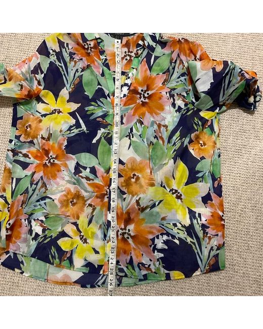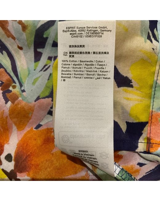 Women's Esprit Floral Blouse in size 14. The blouse features a V-neckline, long sleeves with the option to roll them up, button closure, and a lightweight 100% cotton material. It has a multicoloured floral pattern, a regular fit, and includes a collar.